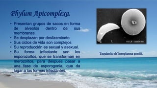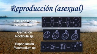 Los protozoos son organismos unicelulares heterótrofos que varían en tamaño y se reproducen por mitosis o sexualmente. Tienen formas activas llamadas trofozoitos que pueden transformarse en quistes para sobrevivir, y algunos son parásitos que afectan a humanos y animales. También cumplen funciones ecológicas, limpiando medios acuáticos y formando parte de cadenas tróficas.