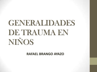 Este documento trata sobre generalidades de trauma en niños y clasificación de fracturas. Resume fracturas específicas de la infancia como fracturas de rodete, tallo verde e incurvación plástica diafisiaria. Explica el mecanismo de producción de fracturas y tipos de fracturas epifisiarias. Finalmente, cubre diagnóstico y tratamiento de fracturas en niños.