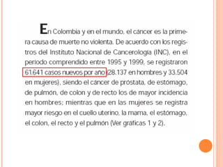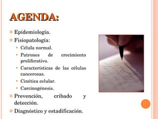 El documento proporciona información sobre oncología y cuidados de enfermería para pacientes con cáncer. Explica conceptos clave como la fisiopatología del cáncer, las características de las células cancerosas, factores de riesgo y métodos de detección, diagnóstico y estadificación del cáncer. También cubre temas como la epidemiología del cáncer, la cinética celular, oncogenes y genes supresores tumorales.