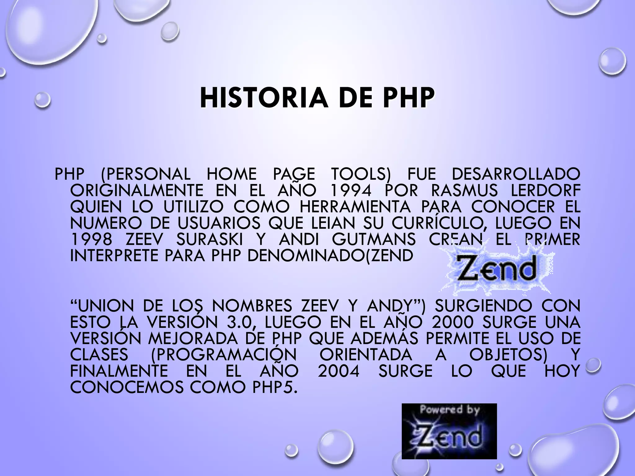 PHP fue creado originalmente en 1994 por Rasmus Lerdorf como una herramienta para contar visitas a su currículum en línea. En 1998, Zeev Suraski y Andi Gutmans crearon la primera versión interpretada de PHP, denominada Zend. En 2000 surgió una versión mejorada que permitía programación orientada a objetos, y en 2004 se lanzó PHP5.