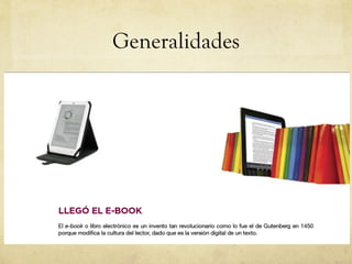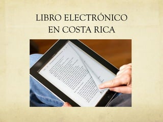 El documento habla sobre el libro electrónico en Costa Rica. Explica la desmaterialización del libro donde el contenido se separa del continente físico y los diferentes formatos electrónicos disponibles. También analiza la distribución de títulos electrónicos en Latinoamérica según el CERLALC y explora el estado actual del libro electrónico específicamente en Costa Rica.