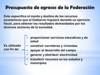 El documento habla sobre el presupuesto de egresos de la Federación Mexicana. Explica que es el documento financiero que establece los gastos que realizará el gobierno federal durante el año y que se obtiene de los impuestos pagados por la sociedad. También describe los principios, control y evaluación del presupuesto, así como conceptos generales sobre derecho tributario y fuentes del derecho mexicano.