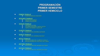 Este documento presenta la programación del primer semestre de anatomía, que incluye 8 trabajos sobre diferentes partes del esqueleto y las articulaciones. También incluye secciones sobre generalidades de anatomía, el sistema óseo, articular y muscular.