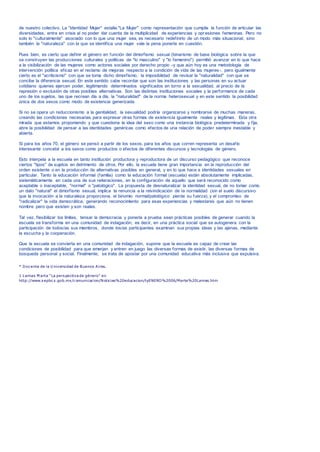 Este documento discute las identidades de género desde la teoría feminista. Explica que el género se construye socialmente en base al sexo biológico, y que las instituciones como la escuela juegan un papel en reproducir las identidades de género normativas. También señala que la noción de que solo existen dos sexos y géneros opuestos ha sido cuestionada, y propone que la escuela debería crear un ambiente más inclusivo para emerger diversas formas de existencia.