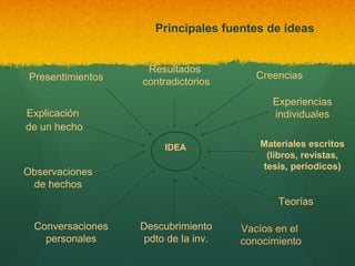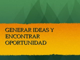 Este documento presenta información sobre la generación de ideas y oportunidades de negocio. Explica las principales fuentes de donde pueden surgir ideas como experiencias, observaciones, material escrito y conversaciones. Luego describe el objetivo general de comprender el proceso de generación de ideas empresariales y los objetivos específicos como analizar procesos de generación de ideas, generar ideas de negocios y brindar herramientas para el emprendimiento. Finalmente, presenta algunos ejemplos de ideas de negocios.