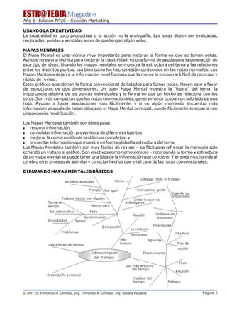 El documento describe diferentes técnicas de pensamiento creativo como el pensamiento estructurado, el pensamiento lateral y el brainstorming. También discute cómo los mapas mentales pueden usarse para tomar notas de manera efectiva al mostrar la estructura general de un tema y las relaciones entre sus partes. Finalmente, ofrece consejos para mejorar la efectividad de los mapas mentales a través del uso de palabras simples, colores, símbolos e imágenes.