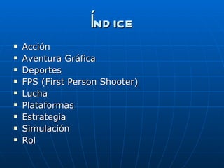 El documento describe los principales géneros de videojuegos, incluyendo acción, aventura gráfica, deportes, FPS, lucha, plataformas, estrategia, simulación y rol. Para cada género, ofrece una breve descripción de sus características fundamentales y algunos ejemplos representativos.