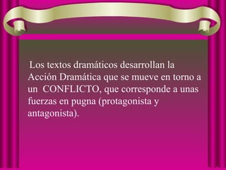 El documento resume los elementos fundamentales del género dramático. Explica que se trata de una representación de conflictos humanos a través de diálogos entre personajes. Describe las partes de una obra dramática como el conflicto, clímax y desenlace, e identifica las principales formas como la tragedia, comedia y drama. Finalmente, detalla elementos como actos, escenas, personajes, diálogos y el uso del espacio y tiempo.
