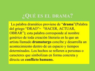 Este documento define el género dramático como aquel que representa conflictos humanos a través del diálogo de los personajes. Explica que proviene de la palabra griega "drama" y que está destinado a ser representado públicamente en un teatro. Describe las formas dramáticas como la tragedia, comedia y drama, y sus características. También diferencia una obra dramática de una obra teatral y explica la estructura externa e interna de una obra dramática.