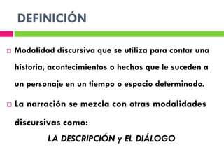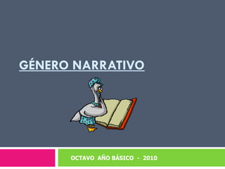 El documento define el género narrativo y sus principales elementos. Explica que la narrativa cuenta una historia a través de un narrador y puede incluir descripciones y diálogos. Describe los componentes clave de una narrativa como los personajes, el espacio, el tiempo y el argumento, así como diferentes estilos y formas de contar historias. Finalmente, identifica varios subgéneros narrativos como la novela, el cuento, la leyenda, la fábula y la parábola.