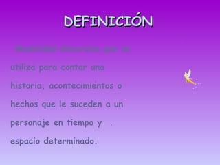 El documento define el género narrativo y sus elementos constitutivos. Explica que la narración cuenta una historia a través de personajes y acontecimientos en un espacio y tiempo determinados. Describe los diferentes tipos de narradores, como el omnisciente, protagonista y testigo; y elementos como el argumento, diálogo y descripción que componen una obra narrativa.