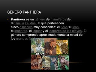 El documento describe el género Panthera, que incluye cinco especies: el tigre, el león, el leopardo, el jaguar y el leopardo de las nieves. Explica que el tigre, el león, el leopardo y el jaguar pueden rugir debido a adaptaciones en la laringe y las cuerdas vocales, mientras que el leopardo de las nieves no puede hacerlo. Además, describe las nueve subespecies de tigre que existieron recientemente, incluidas sus características y estado de conservación