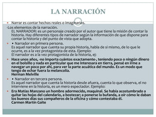 El documento describe los elementos fundamentales de la narrativa. Explica que la narrativa implica contar hechos reales o imaginarios. Detalla los diferentes tipos de narradores (en primera y tercera persona), la acción, el espacio, las características de la narrativa como el uso de tiempos verbales y la coordinación de hechos, y los elementos clave como los personajes, ambientes, acontecimientos y diálogos.