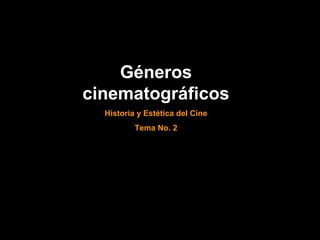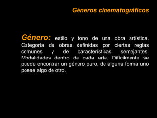 Este documento describe diferentes clasificaciones y tipos de géneros cinematográficos. Identifica tres géneros fundamentales (reportaje fílmico, documental y cine de ficción) y varios géneros por tema como western, terror, musical, policíaco y ciencia ficción. También discute géneros definidos por su tono o tratamiento, como comedia, melodrama, drama y tragedia.