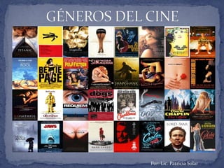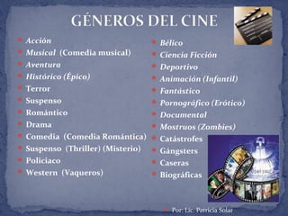 El documento presenta una lista de diferentes géneros cinematográficos como acción, musical, aventura, histórico, terror, suspenso, romántico, drama, comedia, policiaco, western, bélico, ciencia ficción, deportivo, animación, fantástico, pornográfico, documental, entre otros. Luego, proporciona breves definiciones o descripciones de algunos de estos géneros como acción, aventura, histórico, terror, musical, romántico, ciencia ficción, comedia,