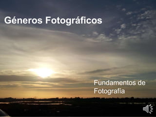 Este documento describe los principales géneros fotográficos: el retrato, la naturaleza muerta, el paisaje, el reportaje y la fotografía científica. Explica cómo se determina cada género en función de si la escena es preparada o encontrada y si el hombre está presente o ausente. También identifica varios subgéneros para cada categoría principal como la fotografía de moda, de guerra, documental y médica.
