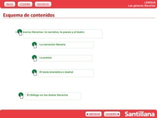 Este documento resume los tres principales géneros literarios: la narrativa, la poesía y el teatro. Explica que la narrativa cuenta una historia a través de un narrador y la inclusión de diálogos y descripciones. La poesía se caracteriza por el uso del verso, la presencia de un yo poético y recursos estilísticos. El teatro presenta obras mediante diálogos entre personajes y acotaciones para su representación escénica.