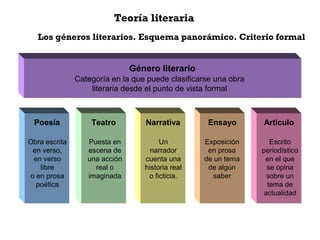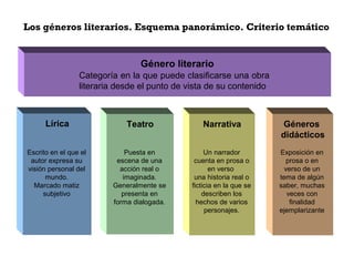 Este documento presenta un esquema panorámico de los principales géneros literarios clasificados según criterios formales y temáticos. Describe los géneros de poesía, teatro, narrativa y didácticos, e incluye ejemplos de cada uno en diferentes épocas literarias como la Edad Media, el Renacimiento y el Barroco. Además, proporciona una guía para analizar textos literarios centrándose en su localización, contenido, estructura y expresión.