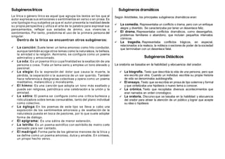 El documento describe los principales géneros literarios según su clasificación original y sus características. Explica que los géneros son épico, lírico, dramático y didáctico. Luego detalla algunos subgéneros de cada uno, como el cuento, la novela y la poesía épica para el género épico; y la canción, la oda y la elegía para el lírico. Finalmente, explica que los géneros y subgéneros han evolucionado con el tiempo.
