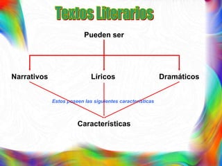 Este documento describe tres tipos principales de textos literarios - narrativos, líricos y dramáticos - y proporciona características y ejemplos de cada uno. Los textos narrativos se escriben en prosa y cuentan una historia, los líricos expresan sentimientos a través de la poesía, y los dramáticos se presentan como diálogos destinados a ser representados.