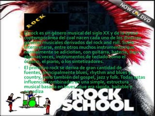 El documento presenta información sobre diferentes géneros musicales como el rock, salsa, electro, baladas, reggae, heavy metal y pop. Describe brevemente el origen y características de cada género y lista algunos artistas representativos. También incluye información sobre la bachata, indicando que se trata de una música popular dominicana de guitarra que ha ganado popularidad entre los latinos en Estados Unidos.
