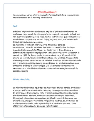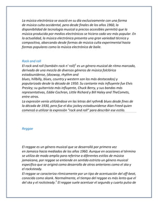El documento resume brevemente los principales géneros musicales como el rock, la música electrónica, el rock and roll, el reggae, la música clásica, el jazz, el blues y la ópera. Describe sus orígenes y características distintivas como el uso de instrumentos, ritmos y estilos vocales.