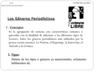 Este documento describe los principales géneros periodísticos como el editorial, la crónica y el periódico. Explica que el editorial es la opinión del periódico sobre las noticias publicadas e incluye título, cuerpo y fecha. La crónica narra e interpreta los hechos noticiosos de manera objetiva pero con un toque personal e incluye titular, lid y cuerpo. Finalmente, describe las características y partes principales de un periódico como la portada, noticias, artículos, reportajes y crónicas.