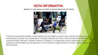 El documento contiene varios artículos periodísticos de diferentes géneros como noticia informativa, editorial, artículo de opinión, columna, caricatura política, crónica y entrevista. Los artículos cubren temas como un ataque terrorista en Túnez que dejó 21 muertos, la situación económica de México ante la caída del precio del petróleo, la situación de los migrantes en el sur de México y la inauguración de un encuentro sobre nuevos cronistas en la Ciudad de México.