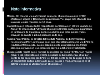 El documento habla sobre las enfermedades respiratorias como el asma y la EPOC en México. Afectan a 10 millones de personas, especialmente niños menores de 15 años, y causan la muerte de 23 mil personas cada año. Expertos dicen que el problema ha sido subestimado en el país, ya que no existe un programa integral de atención y hay falta de apoyo a la investigación. Además, la mitad de los pacientes no tienen un diagnóstico certero y el acceso a medicamentos es deficiente.