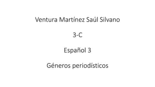 El documento describe diferentes géneros periodísticos como la nota informativa, la crónica, la entrevista, la caricatura política, el fotoperiodismo, el artículo de opinión, la columna, el editorial y la ficha editorial, definiendo brevemente cada uno.