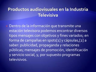 Este documento describe los diferentes tipos de productos audiovisuales y programas televisivos que se transmiten en la industria televisiva, incluyendo publicidad, propaganda, relaciones públicas, promoción, identificación, servicios sociales, noticieros, deportes, entretenimiento, asuntos económicos y sociales, política, religión, cultura y educación. Explica conceptos como spots, cápsulas y géneros periodísticos, y provee detalles sobre cada categoría de programación.