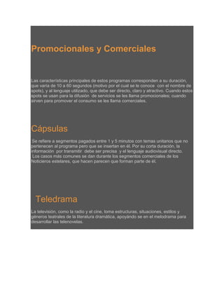 El documento clasifica y describe los diferentes tipos de programas televisivos, incluyendo noticieros, teledramas, programas infantiles, deportivos, documentales, programas de concurso, y más. Explica las características, estructuras y objetivos de cada género.