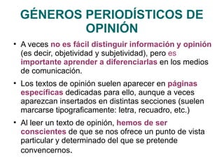 El documento describe tres tipos de géneros periodísticos: informativos, de opinión e interpretativos. Los informativos ofrecen información objetiva como noticias y reportajes objetivos, mientras que los de opinión presentan puntos de vista subjetivos como editoriales, artículos y cartas. Los interpretativos combinan datos objetivos con el enfoque y juicio del periodista como crónicas y entrevistas.