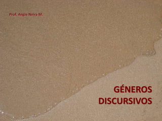 Los géneros discursivos son tipos de textos que comparten características formales y de contenido, y que se usan convencionalmente en situaciones comunicativas específicas. Están determinados por la práctica social y situación en la que ocurren. Algunos ejemplos son cartas, recetas, discursos, artículos académicos. Cada género sigue reglas como el nivel de formalidad, vocabulario, estructura y participación apropiados a su contexto.