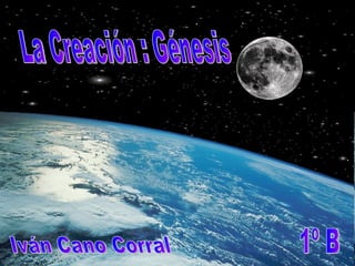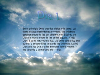 El documento resume los 7 días de la creación según el libro del Génesis. En el primer día, Dios creó la luz y separó la luz de las tinieblas. En el segundo día, creó el cielo. En el tercer día, separó las aguas y creó la tierra y plantas. En el cuarto día, creó el sol, la luna y las estrellas. En el quinto día, creó peces, aves y animales. En el sexto día, creó al hombre y la mujer y les dio dominio sobre la tierra. En