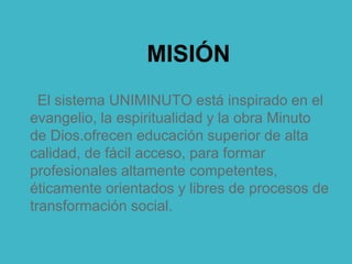 El documento presenta la misión, visión y reglamentos de la Institución Uniminuto. Su misión es ofrecer educación superior de alta calidad y fácil acceso para formar profesionales competentes y éticamente orientados. Su visión es ser reconocido por sus vivencias espirituales universitarias y por la calidad de sus programas académicos. El reglamento describe los derechos y deberes de los estudiantes y las políticas sobre asistencia y cambio de contraseña.