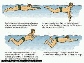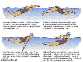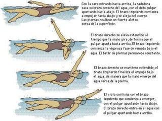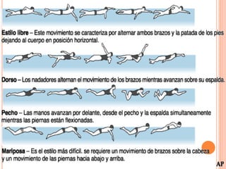 La natación ha evolucionado de una habilidad de supervivencia a un deporte competitivo. Los cuatro estilos principales de natación son braza, mariposa, espalda y crol. La Federación Internacional de Natación (FINA) estableció reglas para estandarizar los estilos de braza, mariposa y espalda. El estilo crol se popularizó por su velocidad y eficiencia.