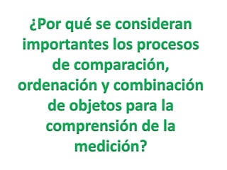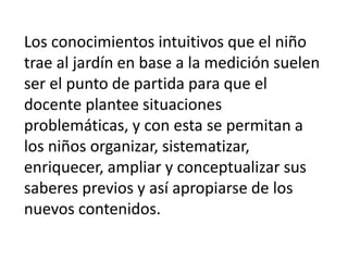 El documento describe cómo los docentes pueden usar los conocimientos intuitivos que los niños traen sobre la medición como punto de partida para plantear situaciones problemáticas. Esto permite a los niños organizar, sistematizar y ampliar sus saberes previos para apropiarse de nuevos contenidos. Inicialmente, los niños realizan estimaciones visuales, pero solo a través de la manipulación pueden distinguir propiedades como peso, capacidad y área de manera más precisa.