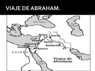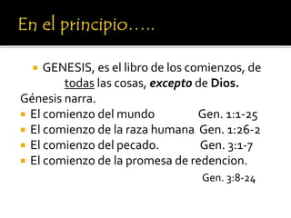 El documento resume el libro de Génesis, comenzando con la creación del mundo y la humanidad. Luego describe la caída del hombre, la promesa de redención, y el comienzo de la vida familiar. También habla sobre el comienzo de la civilización humana y las primeras naciones del mundo. Finalmente, resume la historia de Abraham, Isaac y Jacob.