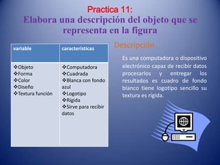 El documento presenta dos prácticas sobre elaborar reglas. La primera práctica propone dos reglas para el uso del uniforme escolar: que debe usarse para ir a la institución y en casos que lo ameriten, y que no debe usarse en lugares como discotecas o bares. La segunda práctica propone dos reglas para normar el comportamiento en el cine: no ingerir bebidas alcohólicas ni fumar dentro de la sala, y no ingresar con armas. También presenta dos prácticas sobre describir objetos mediante sus