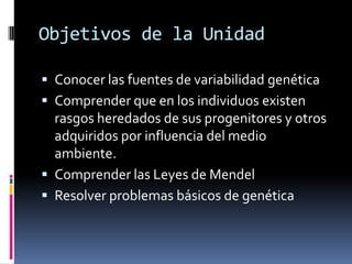 Este documento trata sobre la variabilidad y herencia genética. Explica que la genética estudia la herencia biológica de generación en generación y que los rasgos se heredan a través de alelos. Resume las leyes de Mendel sobre la herencia monohíbrida y dihíbrida y cómo realizar un cuadrado de Punnett. También define la herencia intermedia, codominancia y ligada al sexo.