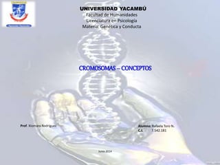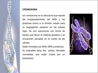 Los cromosomas son estructuras con forma de bastón que llevan el material genético y se encuentran ubicados en el núcleo de las células. Están formados por ADN, ARN y proteínas. Su esqueleto tiene dos partes, llamadas cromáticas, que están unidas por un centrómero.