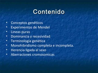 Este documento trata sobre conceptos básicos de genética como los experimentos de Mendel, las líneas puras, la dominancia y recesividad. Explica las leyes de la herencia de Mendel incluyendo la segregación y la transmisión independiente de los alelos. También menciona genetistas modernos como Svante Pääbo y sus descubrimientos relacionados con el gen del lenguaje. El objetivo es que los estudiantes comprendan los principios de la herencia mendeliana y puedan describir cruces genéticos y aberraciones c