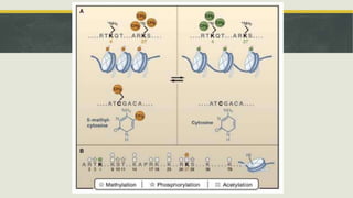 El documento describe los principales mecanismos epigenéticos que regulan la expresión génica, incluyendo la metilación del ADN, las modificaciones post-traduccionales de las histonas, el silenciamiento mediado por ARN no codificante y el remodelado de la cromatina dependiente de ATP. También explica cómo alteraciones en estos mecanismos epigenéticos pueden dar lugar a síndromes y enfermedades como el síndrome ICF, el síndrome de Rett, el síndrome de ATRX y el sínd
