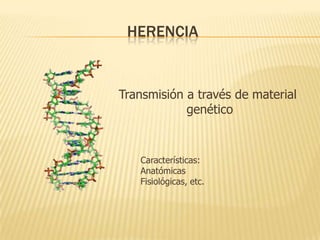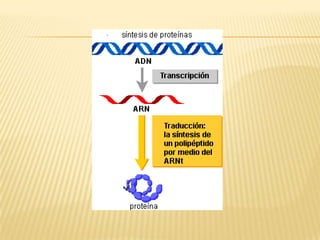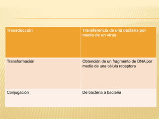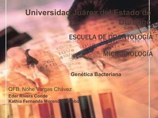 Este documento trata sobre la genética bacteriana. Explica conceptos como la herencia genética a través de material genético, cromosomas, proteínas, el dogma central de la biología molecular, ácidos nucleicos como el ADN y ARN, nucleótidos, replicación del ADN, transcripción, traducción, control de la función genética a través de regulación genética y enzimática, plásmidos, bacteriófagos, mecanismos de transferencia de genes, mutaciones, resistencia bacteriana y bibliografía.