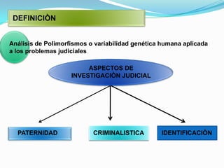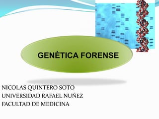 Este documento resume los principales aspectos de la genética forense, incluyendo el análisis de polimorfismos de ADN genómico y mitocondrial para aplicaciones como la paternidad, criminalística e identificación. Describe técnicas como la digestión con enzimas de restricción, reacción en cadena de la polimerasa y electroforesis para analizar muestras de ADN pequeñas o degradadas.