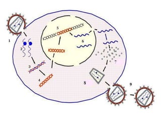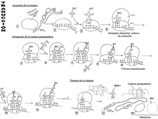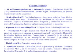 Este documento resume los principales conceptos y procesos de la genética molecular como la replicación, transcripción y traducción del ADN. Explica las diferencias entre cómo ocurren estos procesos en organismos procariotas versus eucariotas, y describe experimentos clave como los de Griffith y Hershey-Chase que establecieron el papel del ADN como material genético. También resume el código genético y procesos como la retrotranscripción en retrovirus.