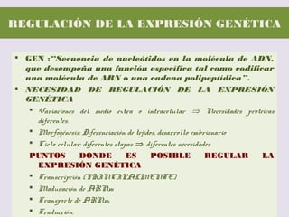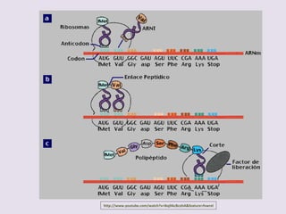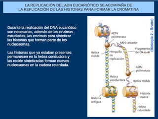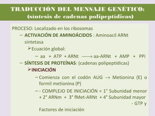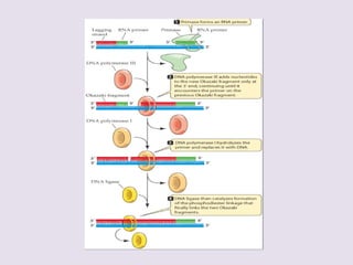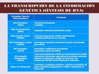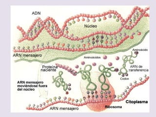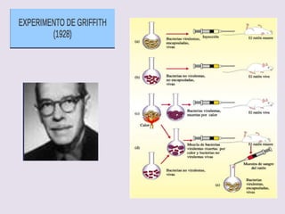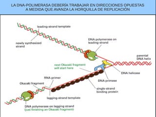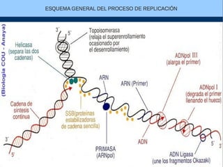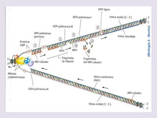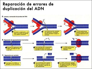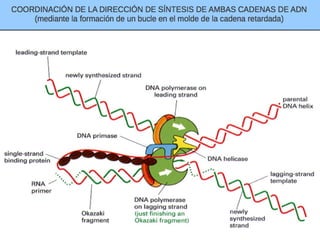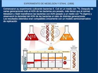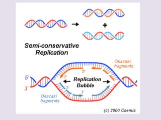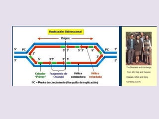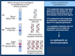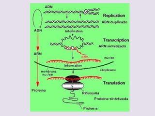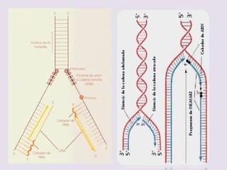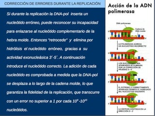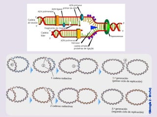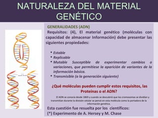 El documento describe la naturaleza del material genético y la transcripción de la información genética. Explica que el experimento de Hershey y Chase demostró que el ADN, y no las proteínas, es el portador de la información genética. También describe los procesos de replicación del ADN, incluida la replicación semiconservativa y los mecanismos de corrección de errores.