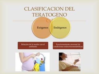 Este documento clasifica los teratógenos en exógenos y endógenos. Los exógenos incluyen agentes biológicos, químicos y físicos que afectan la relación de la madre con el ambiente, mientras que los endógenos se refieren a condiciones endocrino-metabólicas maternas anormales. Se describen varios ejemplos de cada tipo de agente teratógeno y sus efectos en el desarrollo fetal.