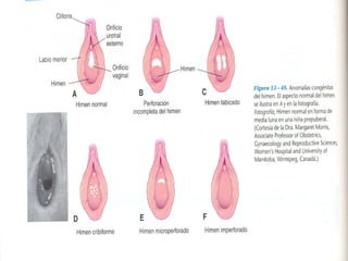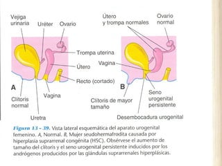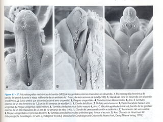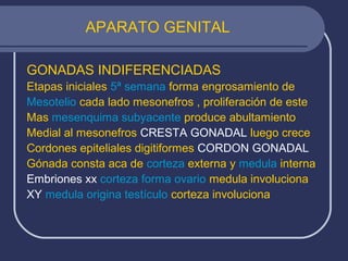 El documento describe el desarrollo del aparato genital desde la 5a semana hasta el nacimiento. En la 5a semana se forman las crestas gonadales indiferenciadas que luego darán origen a los testículos u ovarios. La determinación del sexo depende del cromosoma Y. El desarrollo testicular requiere la producción de andrógenos y sustancia inhibidora mulleriana, mientras que el desarrollo ovárico no necesita estimulación hormonal. También se detalla el desarrollo de los conductos genitales, glánd
